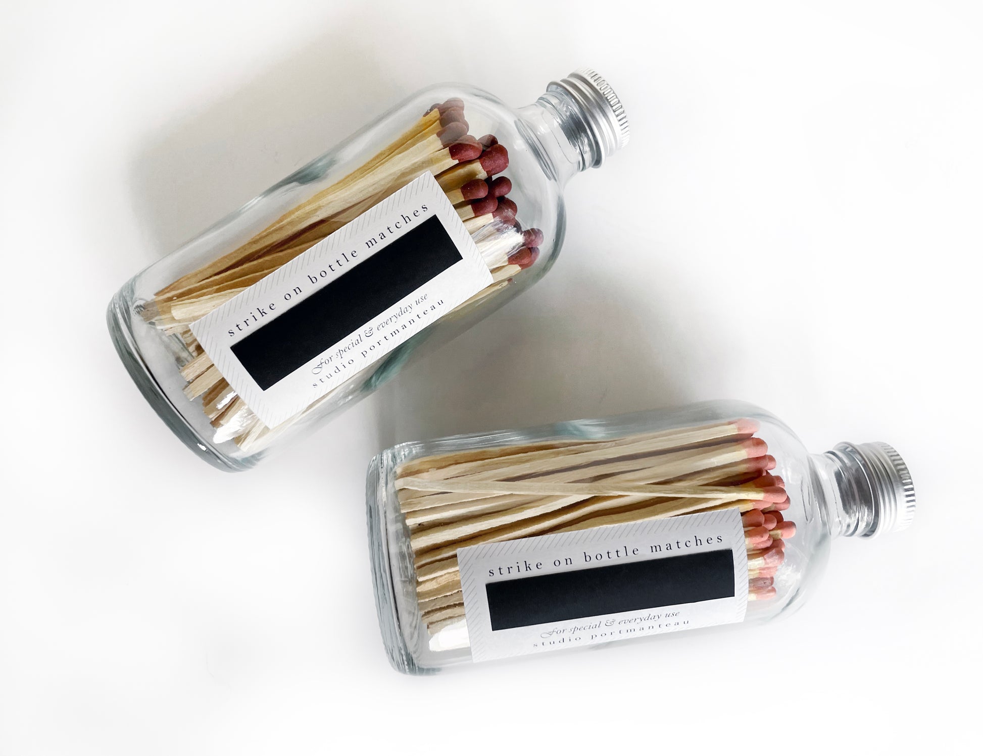 The tall, round glass bottle contains about sixty (60) over-sized, 4" long wooden matches with natural stems and salmon pink tips. A convenient striker strip is incorporated into a simple, signature label on one side. You can hide the label or feature it when you display your bottle, your choice, but it's always there when you need to light a match. The bottle closes with a silver, metal, water-tight lid. Take your matches anywhere, or keep them on your mantle looking pretty. A moment of calm or celebration in a bottle...