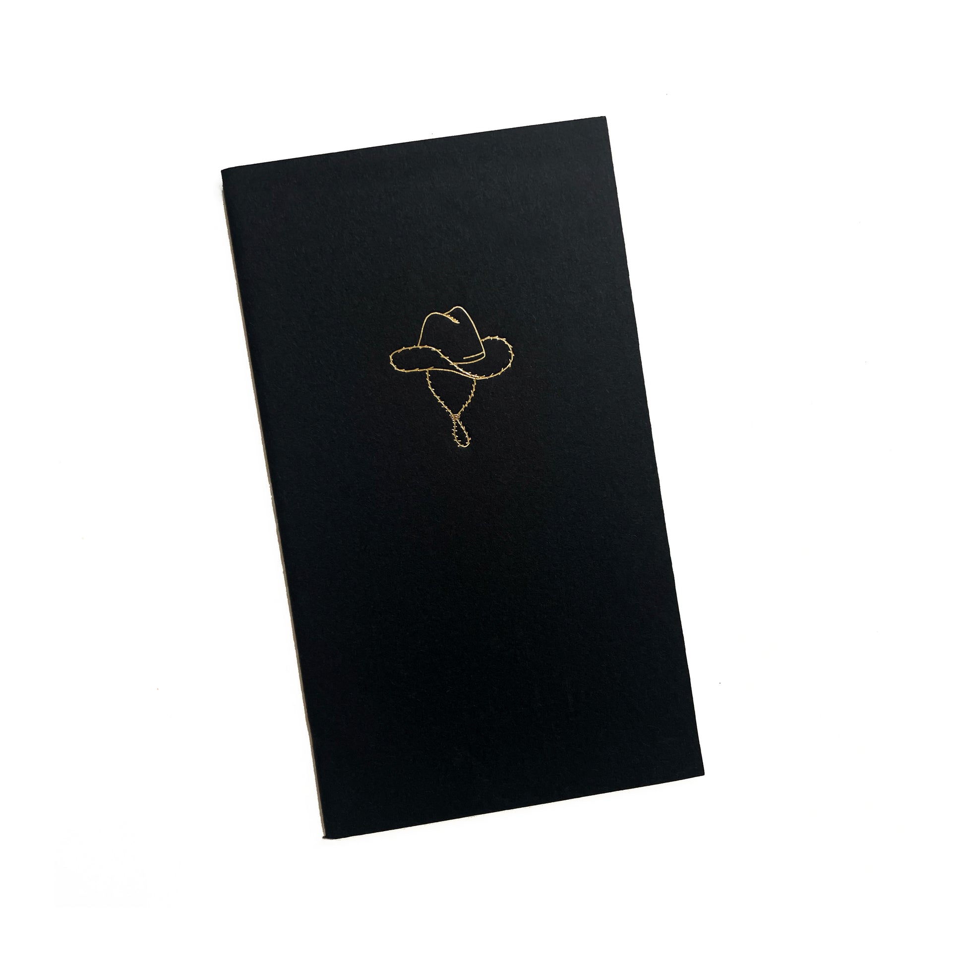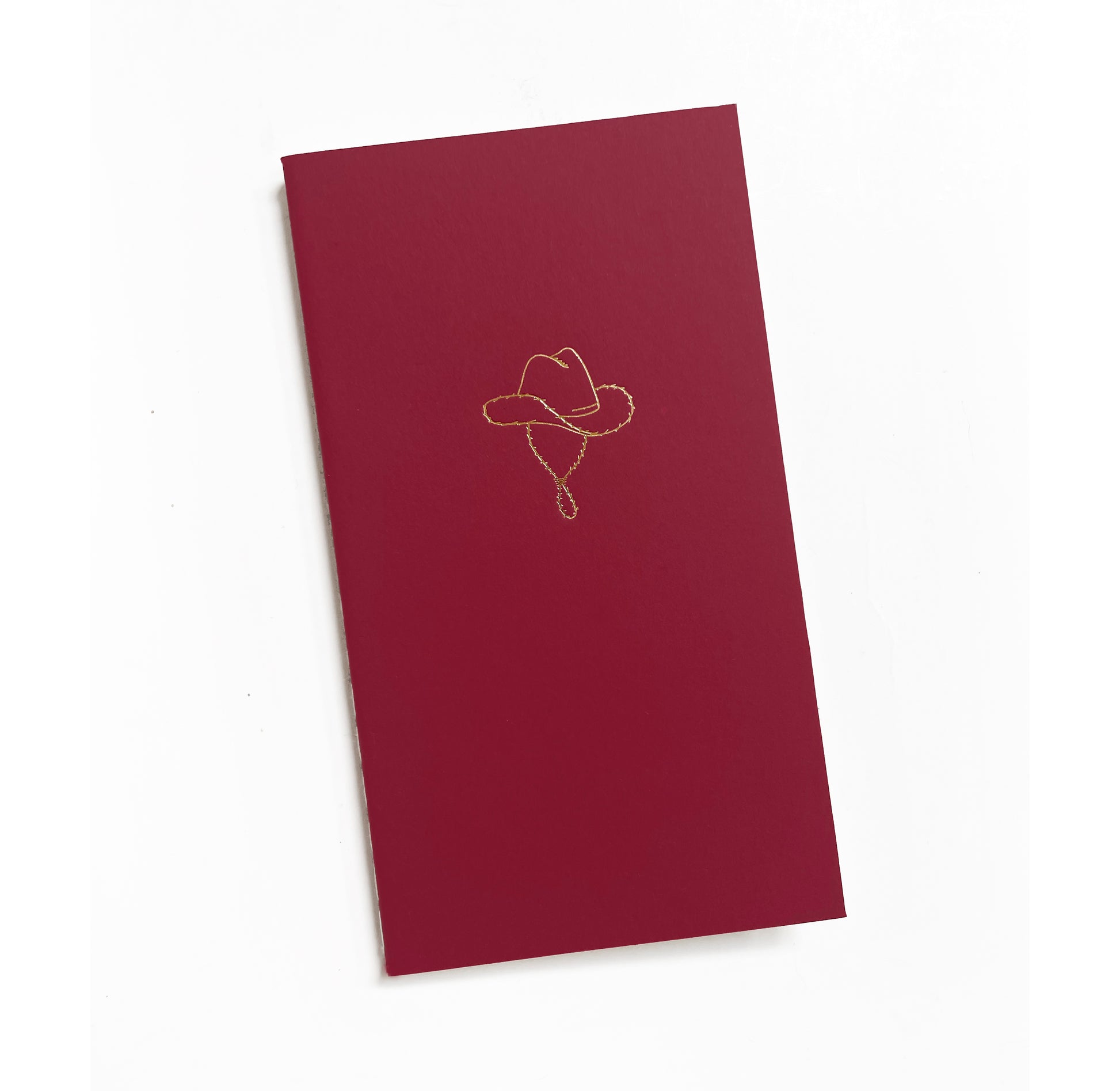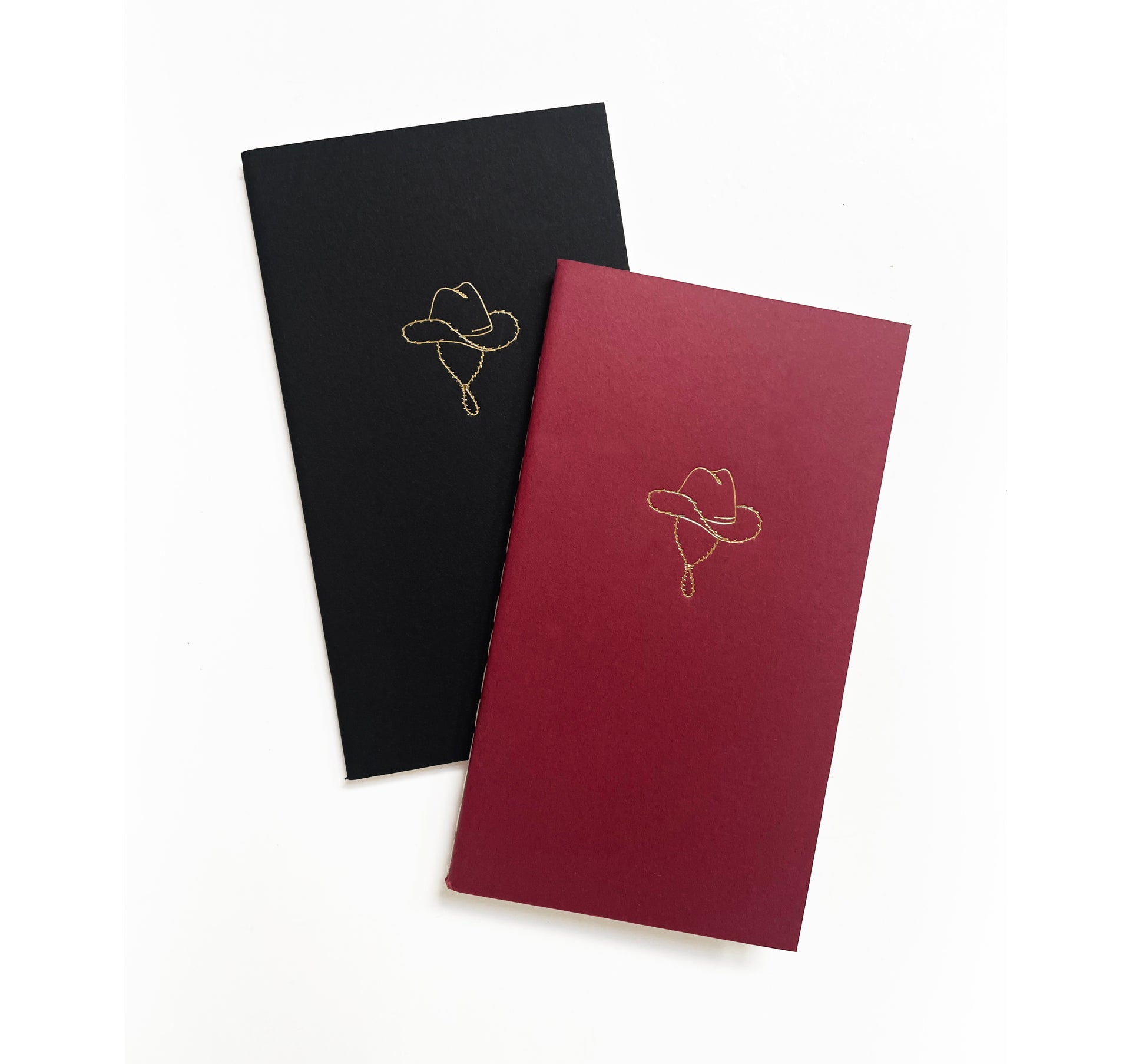 Keep your notes organized in style with these sweet, handy saddle stitch notebooks, foil pressed with a cowboy / cowgirl hat in your choice of foil color and notebook cover color.