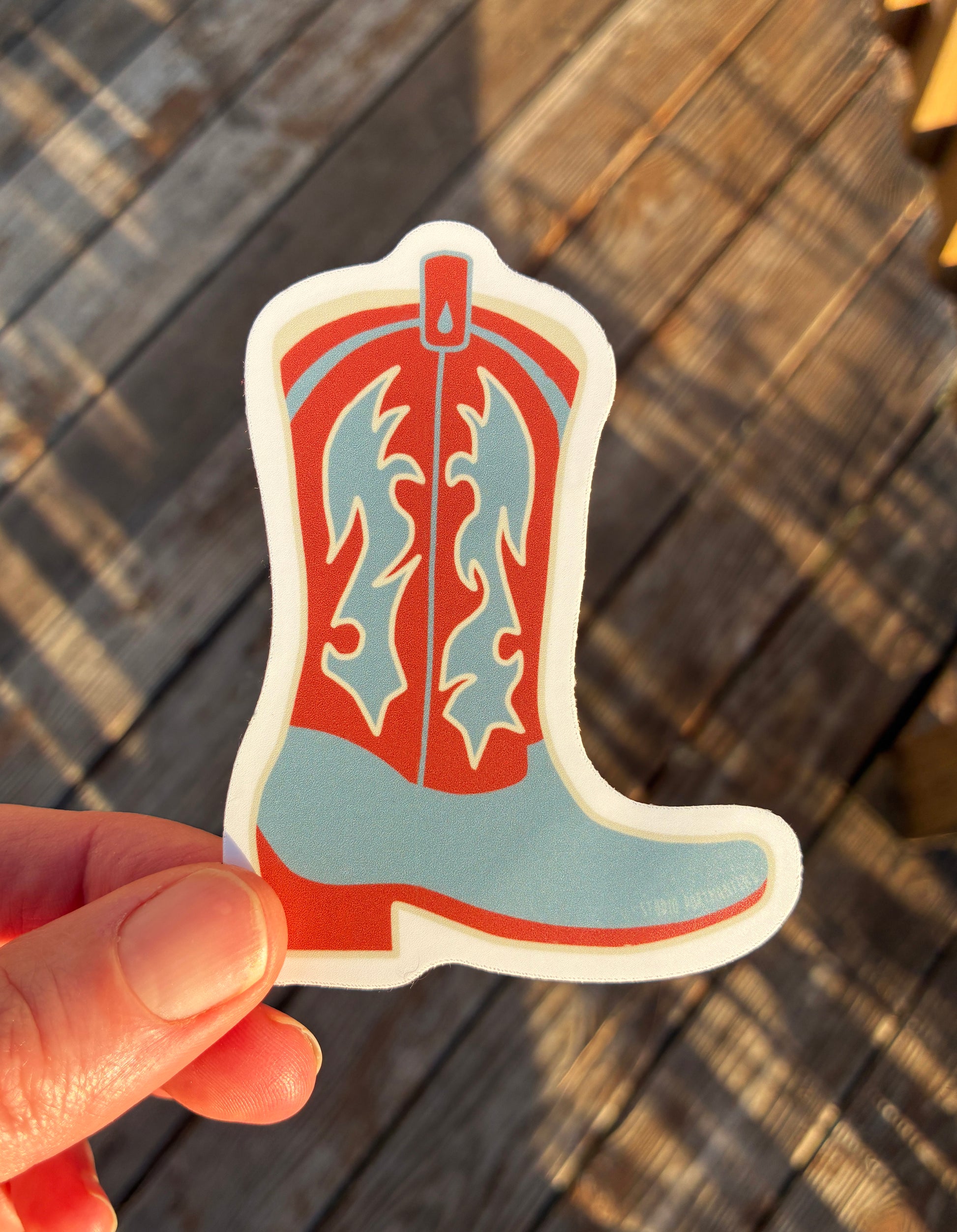 This waterproof, vinyl sticker features our custom rust brown, sky blue, and cream colored classic Western style, cowboy or cowgirl boot illustration with a die cut border. These water-resistant stickers work great on your favorite thermos, water bottle, laptop, phone case, car bumper, notebook, planner, journal, scrapbook, gift wrap, or other special spot!