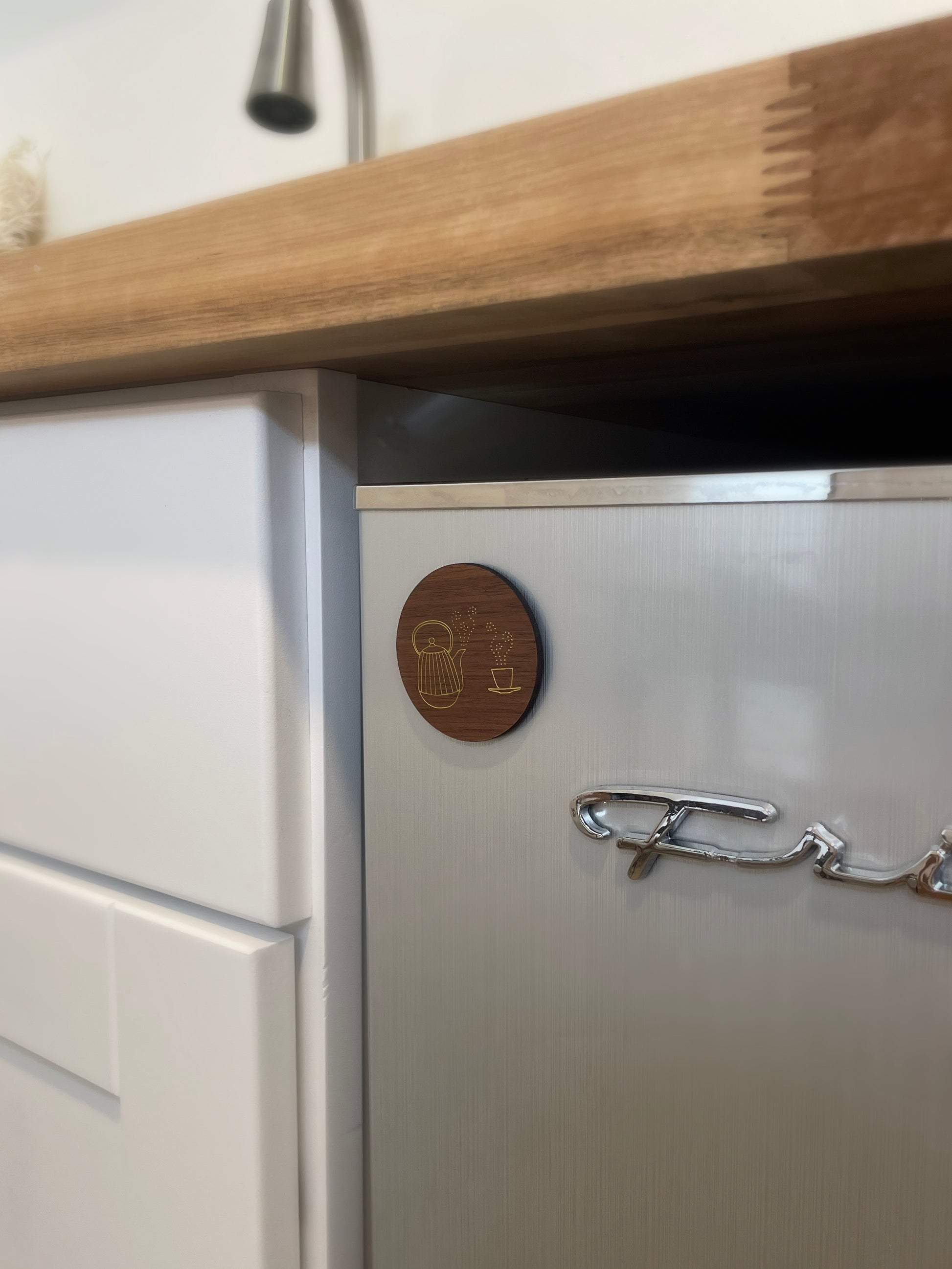 Fill your cup with coziness with this teapot magnet! With a drawing of a steaming teapot and matching cup and saucer, these walnut wood magnets are made to accompany many cozy afternoons with a cuppa tea.