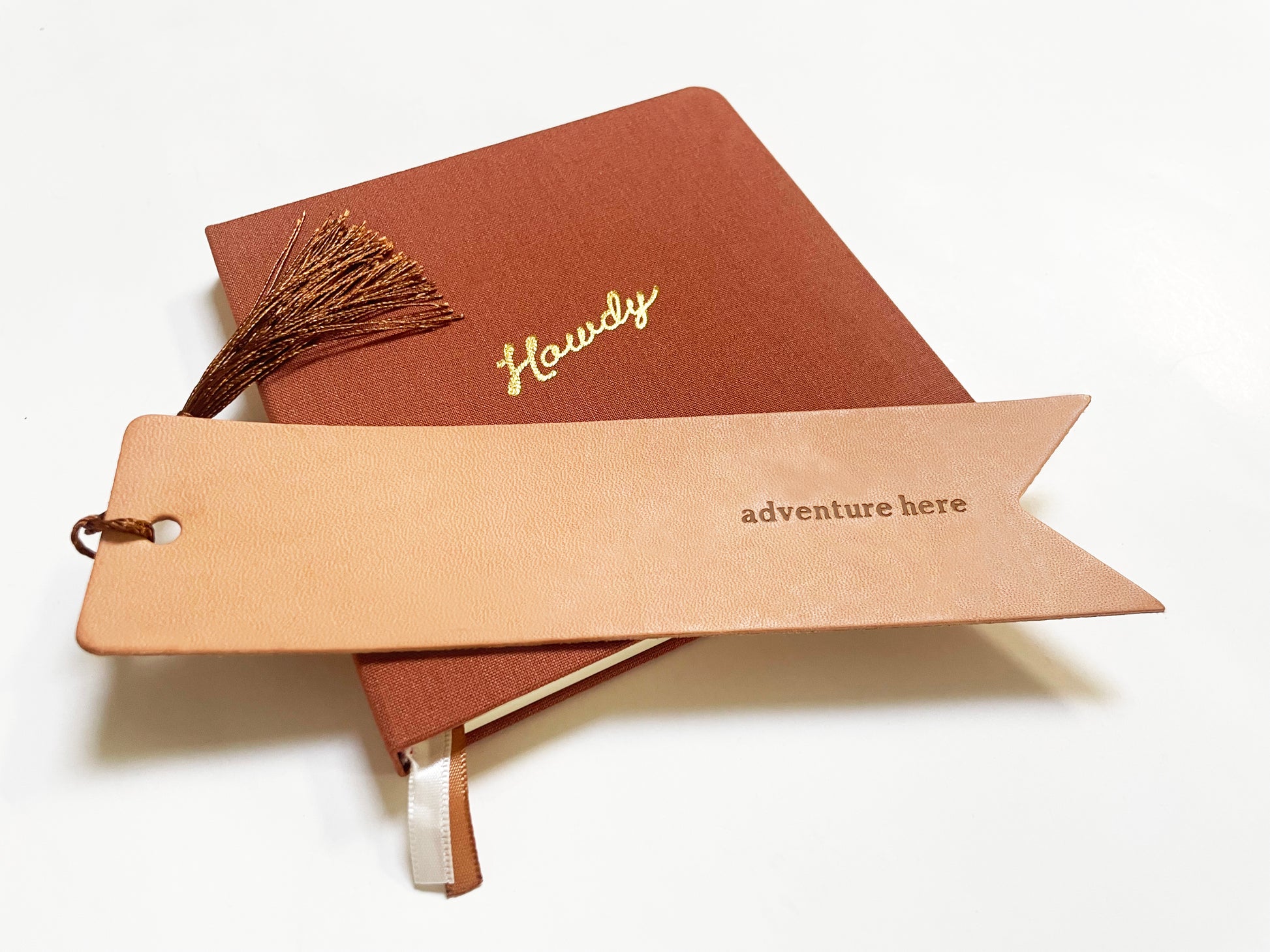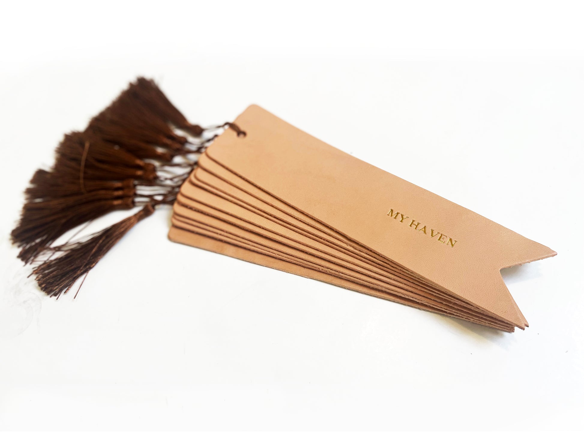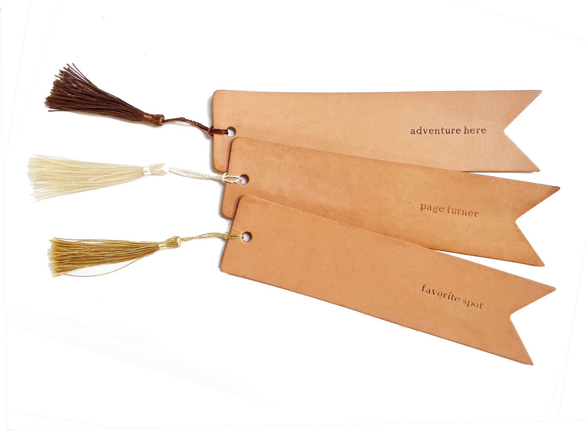 Adorned with the words, initials, monogram, name, date, or other short phrase in your foil press color of choice, these gorgeous tan, genuine leather bookmarks add the perfect custom touch. Each book mark comes with the same letters foil pressed / embossed on the cover in a timeless serif font. Bookmark size is 2" x 8" x 1/16" thick with a golden tassel (or other color of your choice). The bookmarks are cut from genuine leather from a 25-year-old company in Missouri, and each bookmark is foil pressed by hand at Studio Portmanteau in Oregon. Leather grain is distressed and contains natural imperfections.