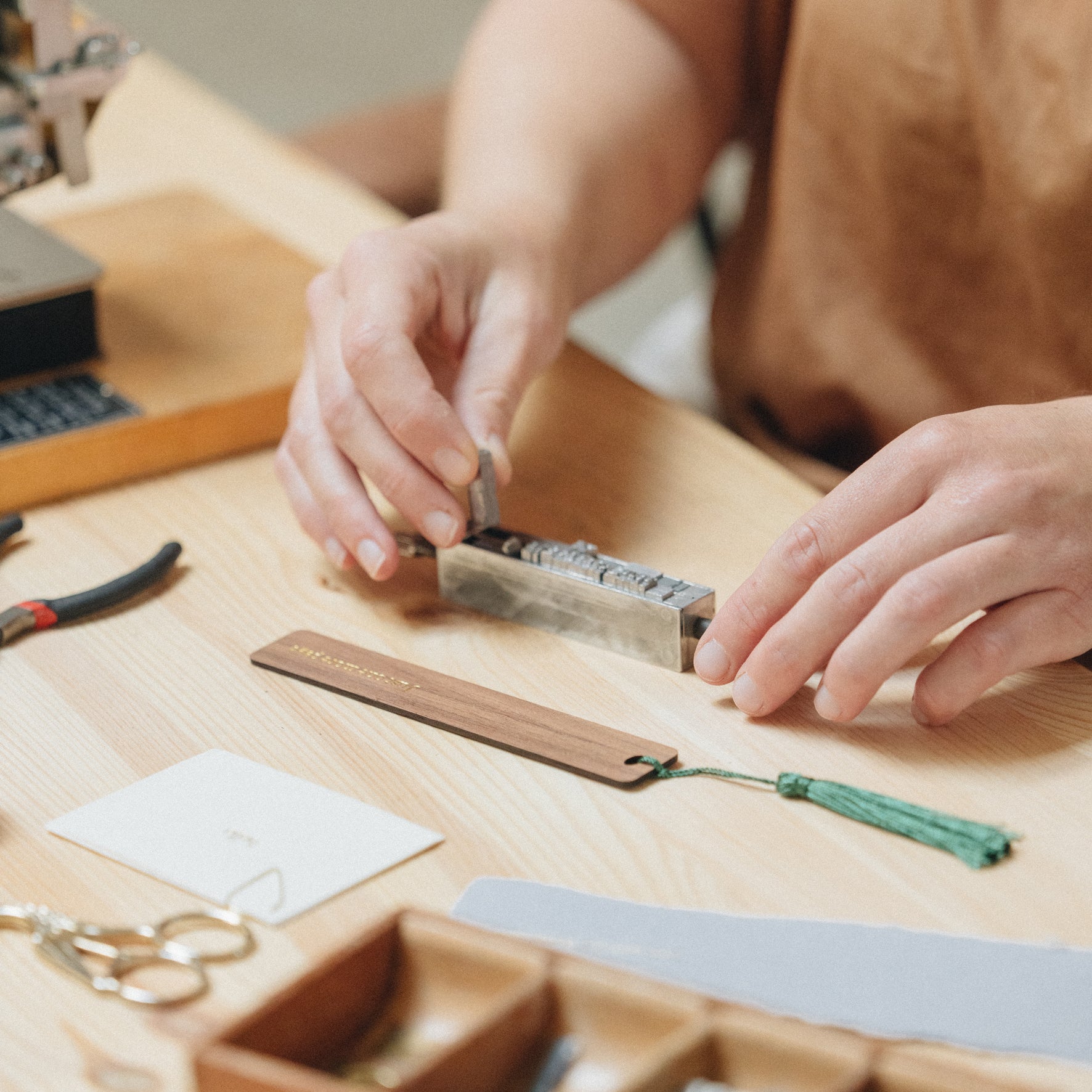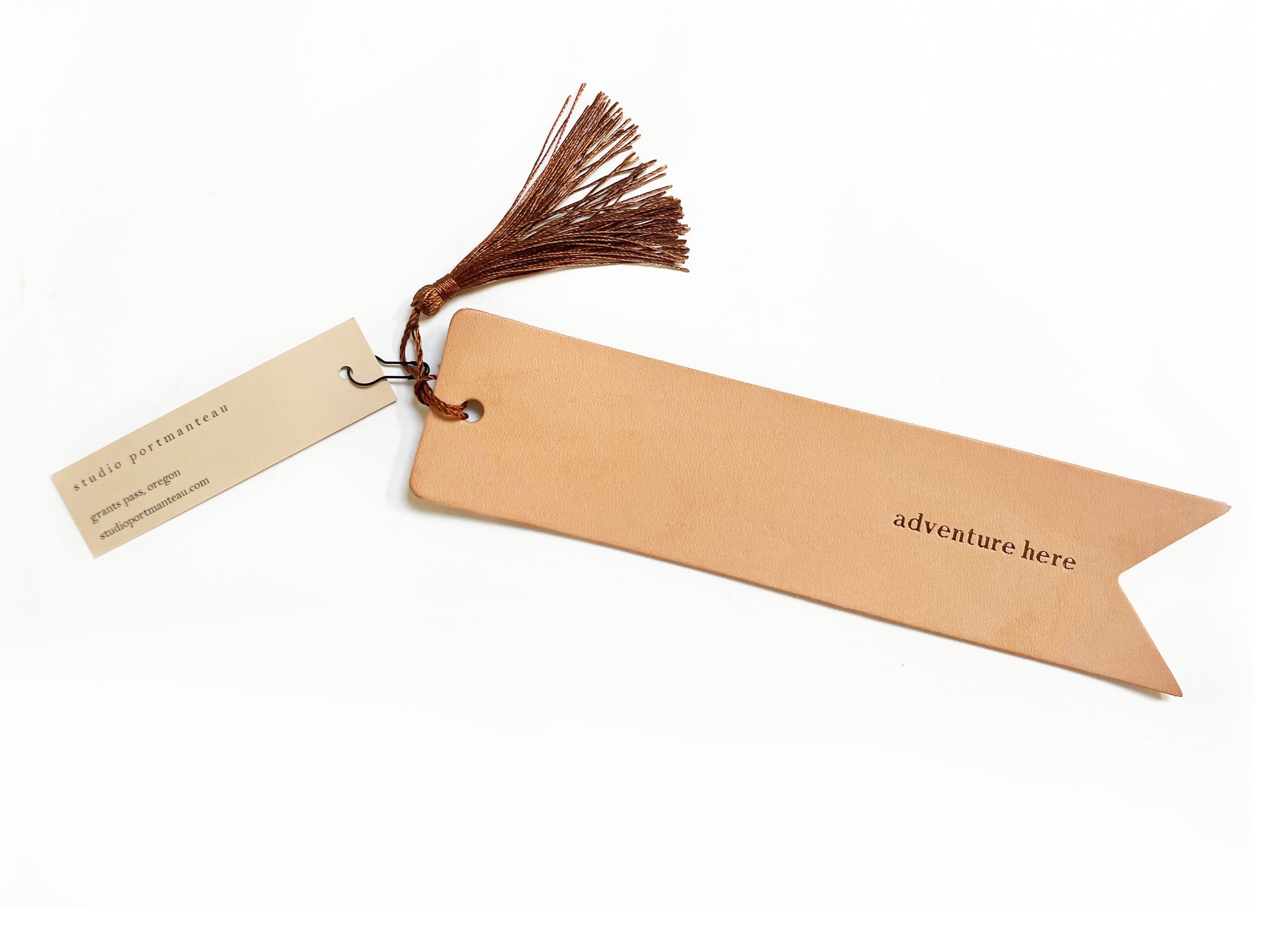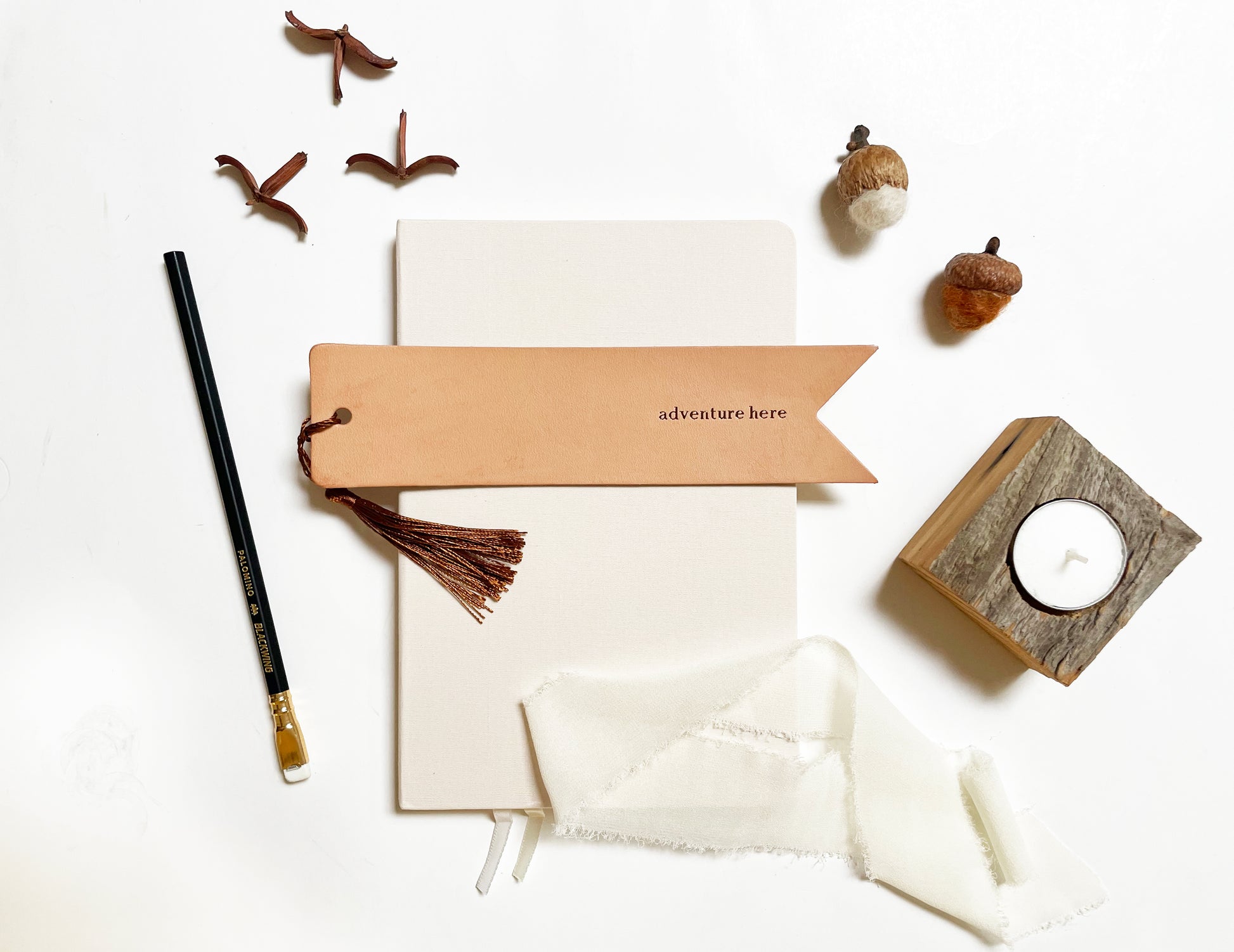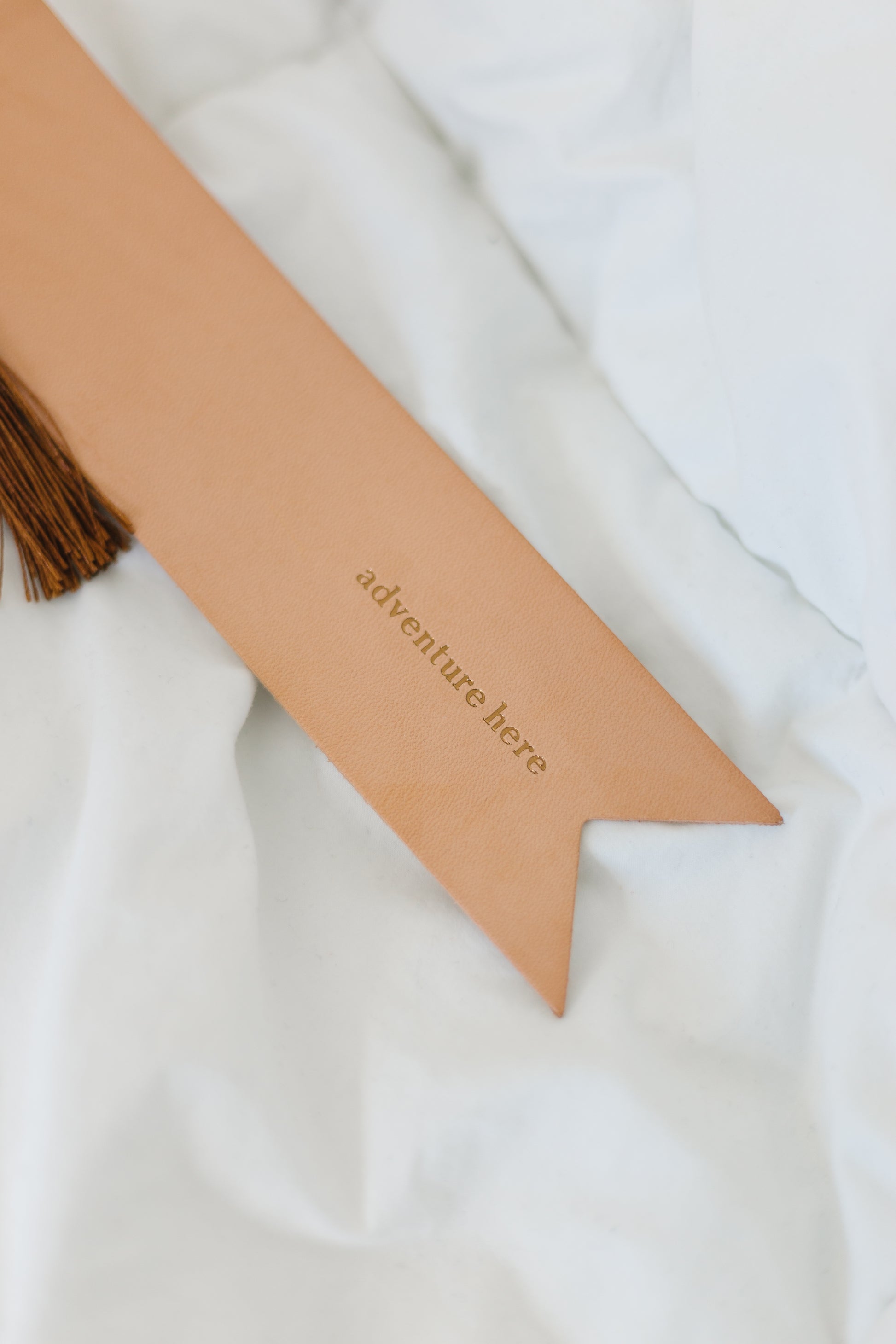 Adorned with the words, initials, monogram, name, date, or other short phrase in your foil press color of choice, these gorgeous tan, genuine leather bookmarks add the perfect custom touch. Each book mark comes with the same letters foil pressed / embossed on the cover in a timeless serif font. Bookmark size is 2" x 8" x 1/16" thick with a golden tassel (or other color of your choice). The bookmarks are cut from genuine leather from a 25-year-old company in Missouri, and each bookmark is foil pressed by hand at Studio Portmanteau in Oregon. Leather grain is distressed and contains natural imperfections.
