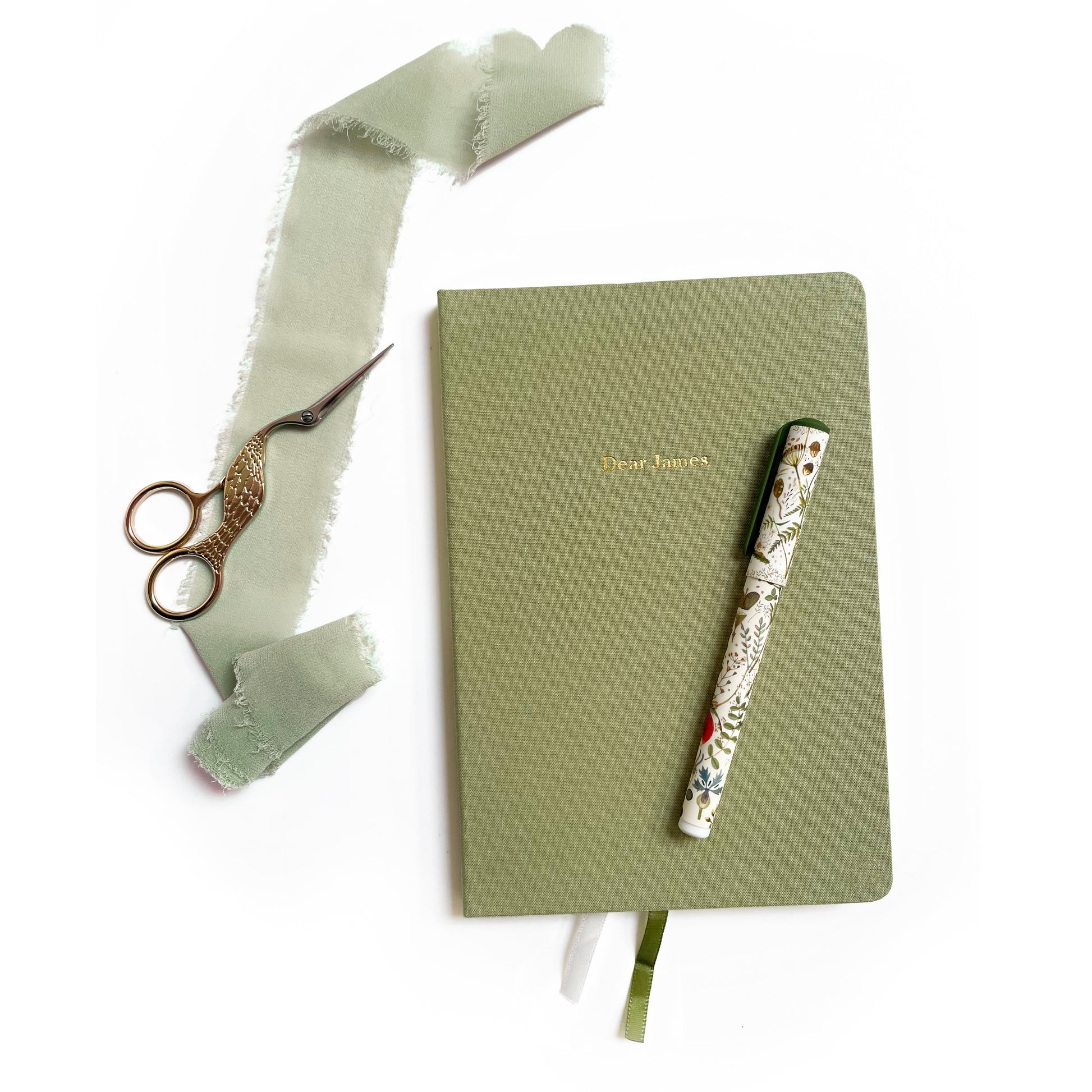 Adorned with the words, initials, monogram, name, date, or other favorite short phrase in your foil press color of choice, these blank note books bound with linen bookcloth covers add the perfect customized touch. Each notebook comes with the same letters foil pressed / embossed on the cover in a timeless serif font, in your choice of foil color on a sage green, rose pink, or dusty blue linen cover.
