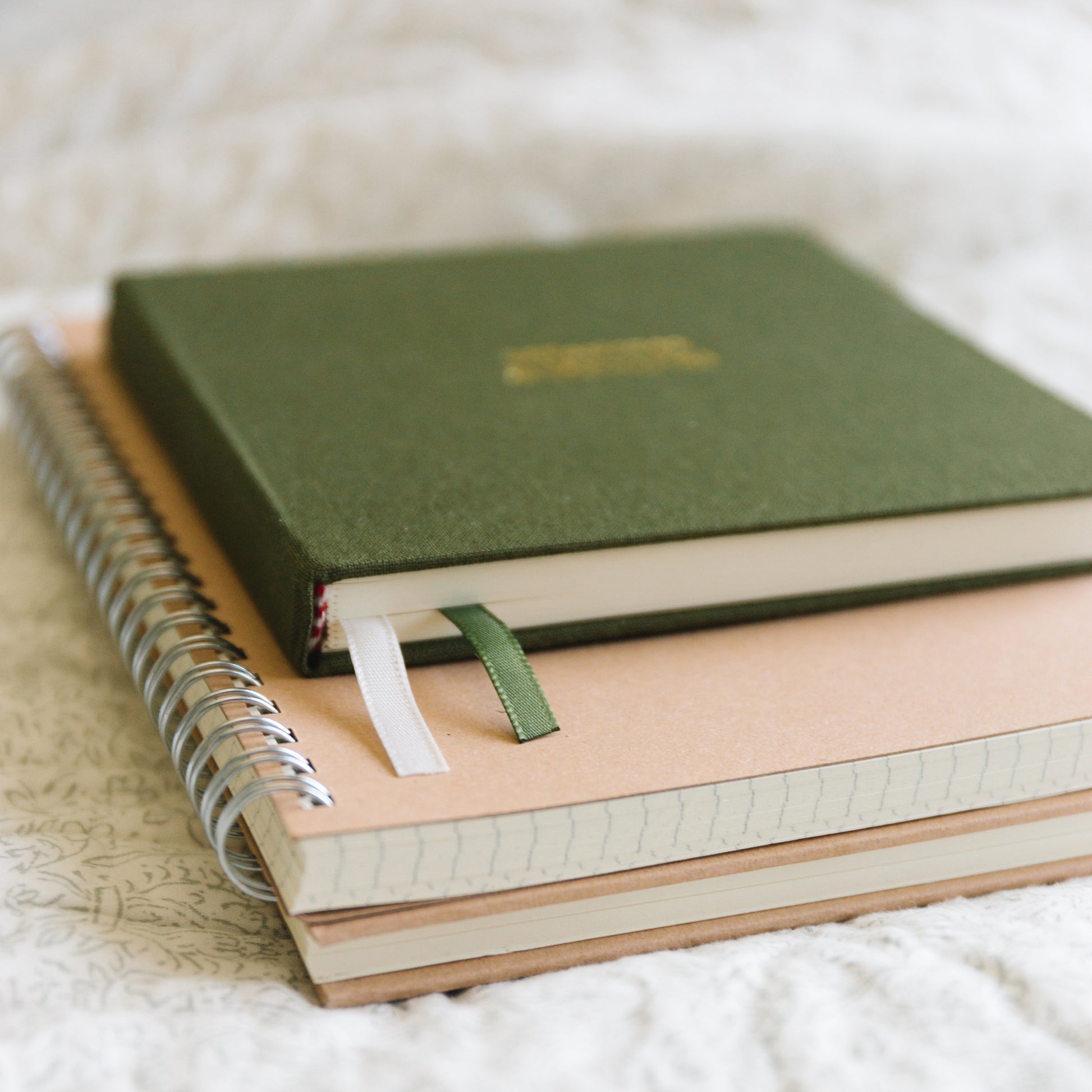 Adorned with the words, initials, monogram, name, date, or other short phrase in your foil press color of choice, these blank notepads bound with linen hardcovers add the perfect custom touch. Each notebook comes with the same letters foil pressed / embossed on the cover in a timeless serif font, in your choice of foil color on a deep olive green, sandy caramel beige, or earthy rust brown linen-bound hardcover.