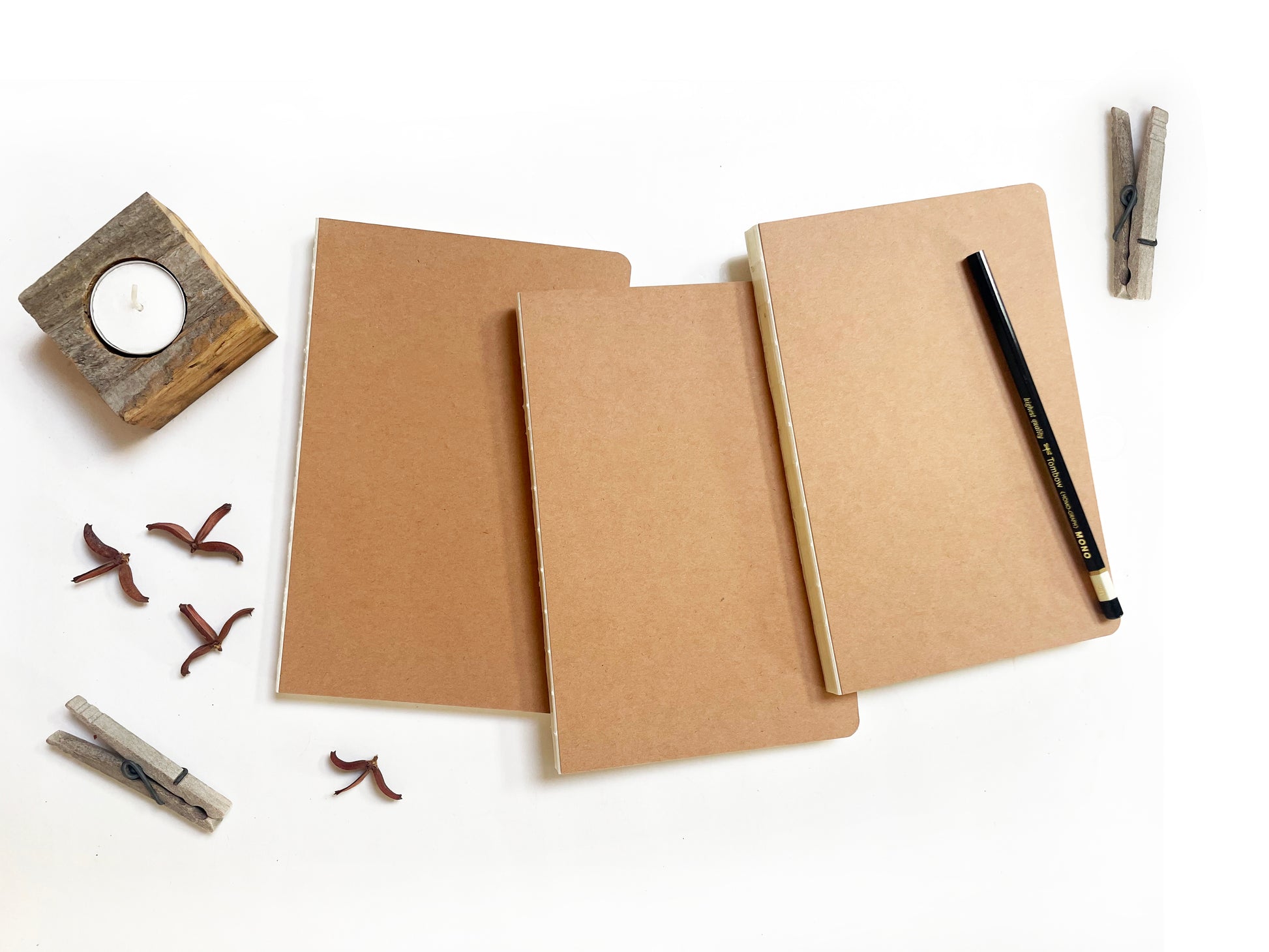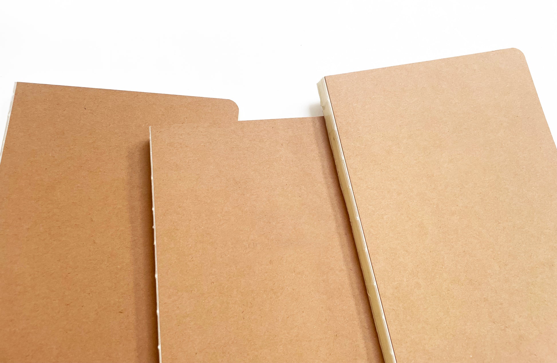 Journal size is 8.3" x 5.5" with exposed coptic binding and a kraft cardstock cover. 80 blank pages / 160 sheets. Cover board weight is 350 gsm. Interior paper weight is 100 gsm, and is designed to hold up to ballpoint pens, rollerball pens, fountain pens, and highlighters.