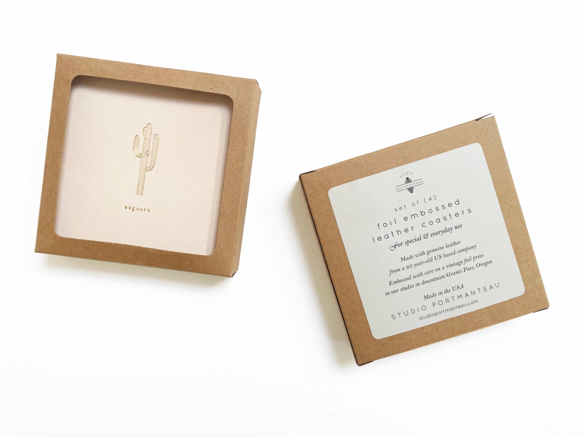 Coaster size is 4" x 4" (a standard coaster size), and the foil is embossed onto 1/8" thick genuine leather. The coasters are cut from genuine leather from a 25-year-old company in Missouri, and each coaster is foil pressed by hand at Studio Portmanteau in Oregon. Leather grain is distressed and contains natural imperfections. As always, well-designed and well-crafted.