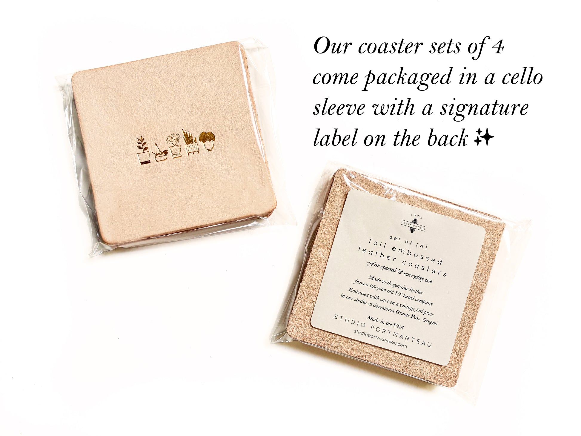 Coaster size is 4" x 4" (a standard coaster size), and the foil is embossed onto 1/8" thick genuine leather. The coasters are cut from genuine leather from a 25-year-old company in Missouri, and each coaster is foil pressed by hand at Studio Portmanteau in Oregon. Leather grain is distressed and contains natural imperfections. As always, well-designed and well-crafted. This listing is for a set of 4 coasters, packaged for gifting.