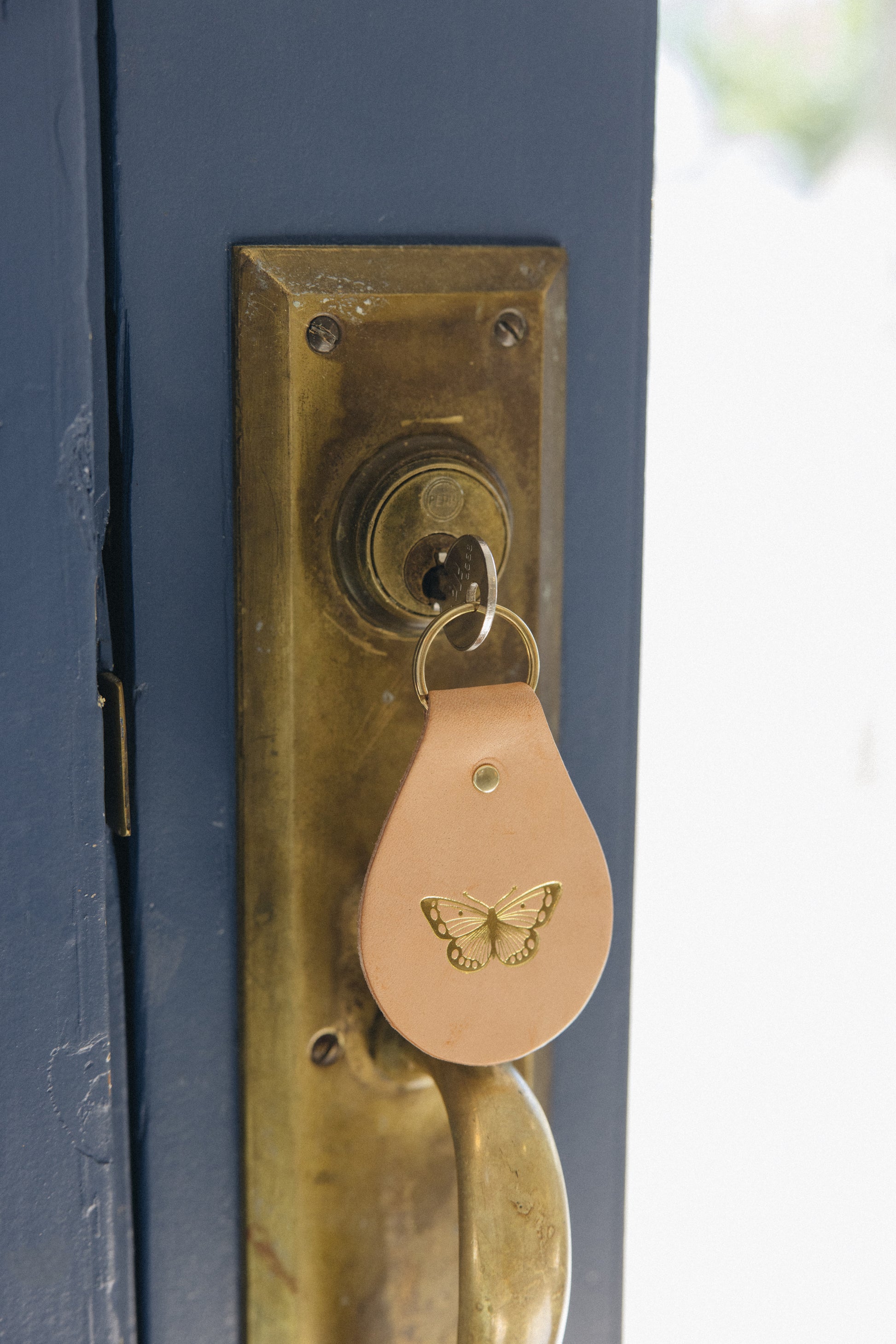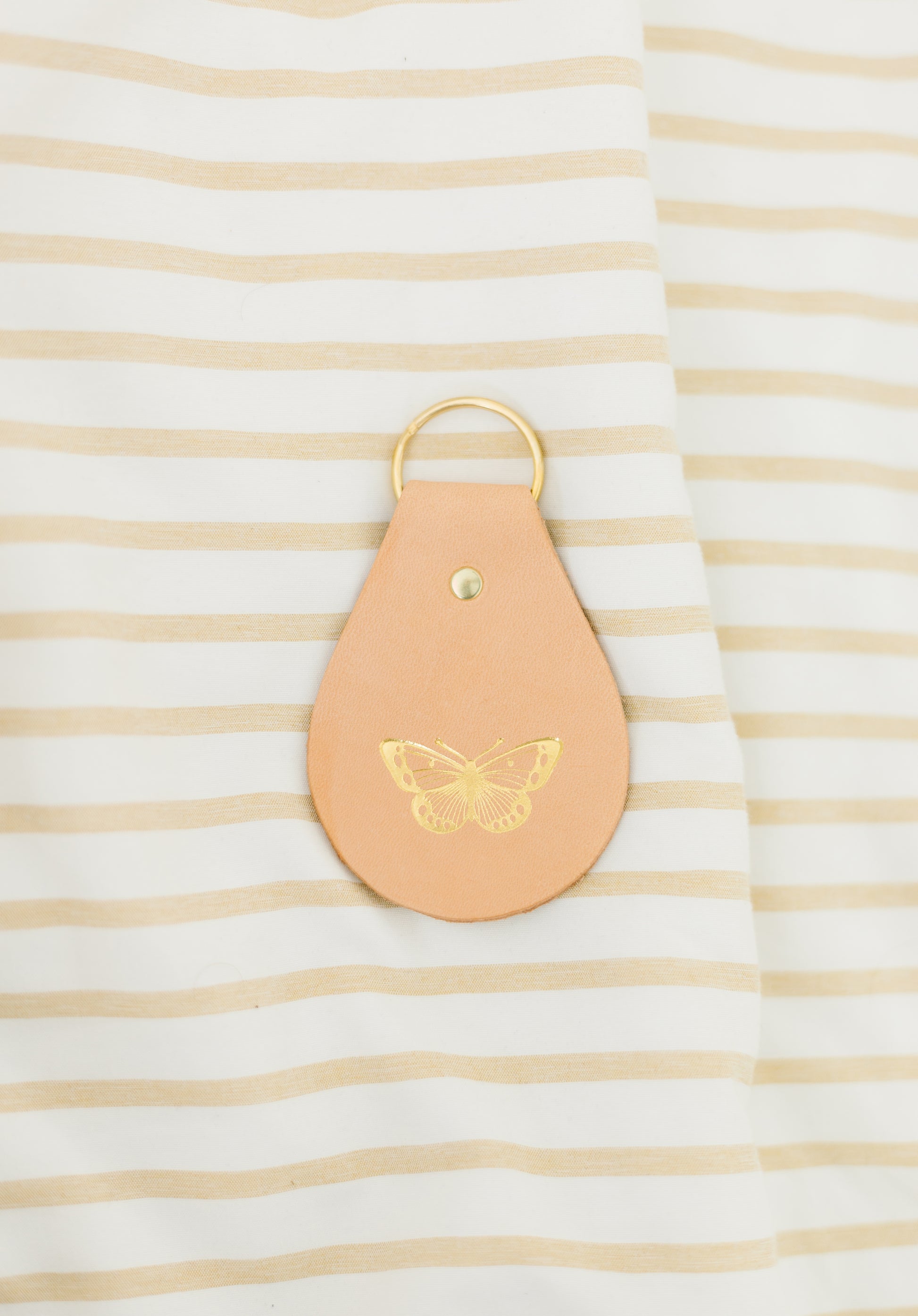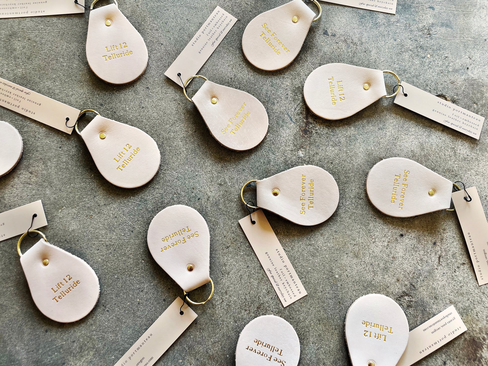 The leather area of the keychain is 2" x 3" x 3/16" thick with burnished edges, and is connected to a smooth, rounded, gold-plated metal split ring. Each key fob comes with our signature tag describing it, ready for gifting.