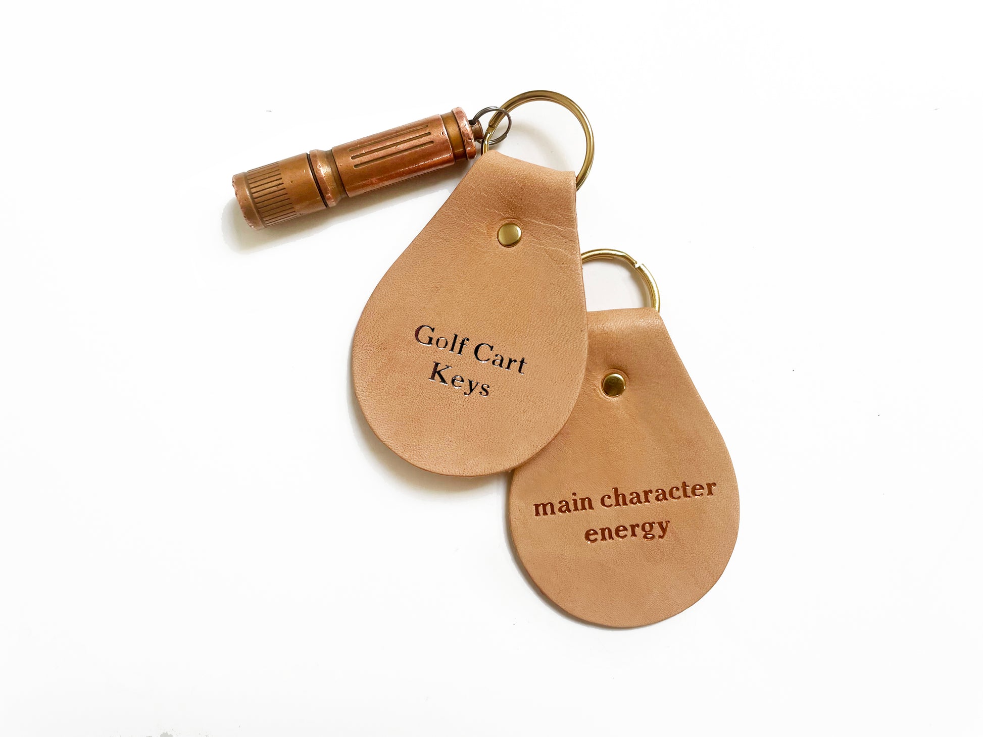 Adorned with the words, initials, monogram, name, meme, or other favorite phrase in your foil press color of choice, these handy leather keychains add the perfect custom touch. Each genuine leather keychain comes with the same letters foil pressed / embossed on the front in a timeless serif font.