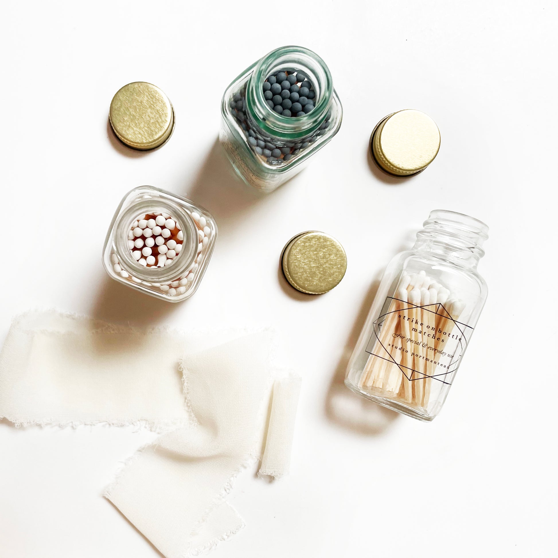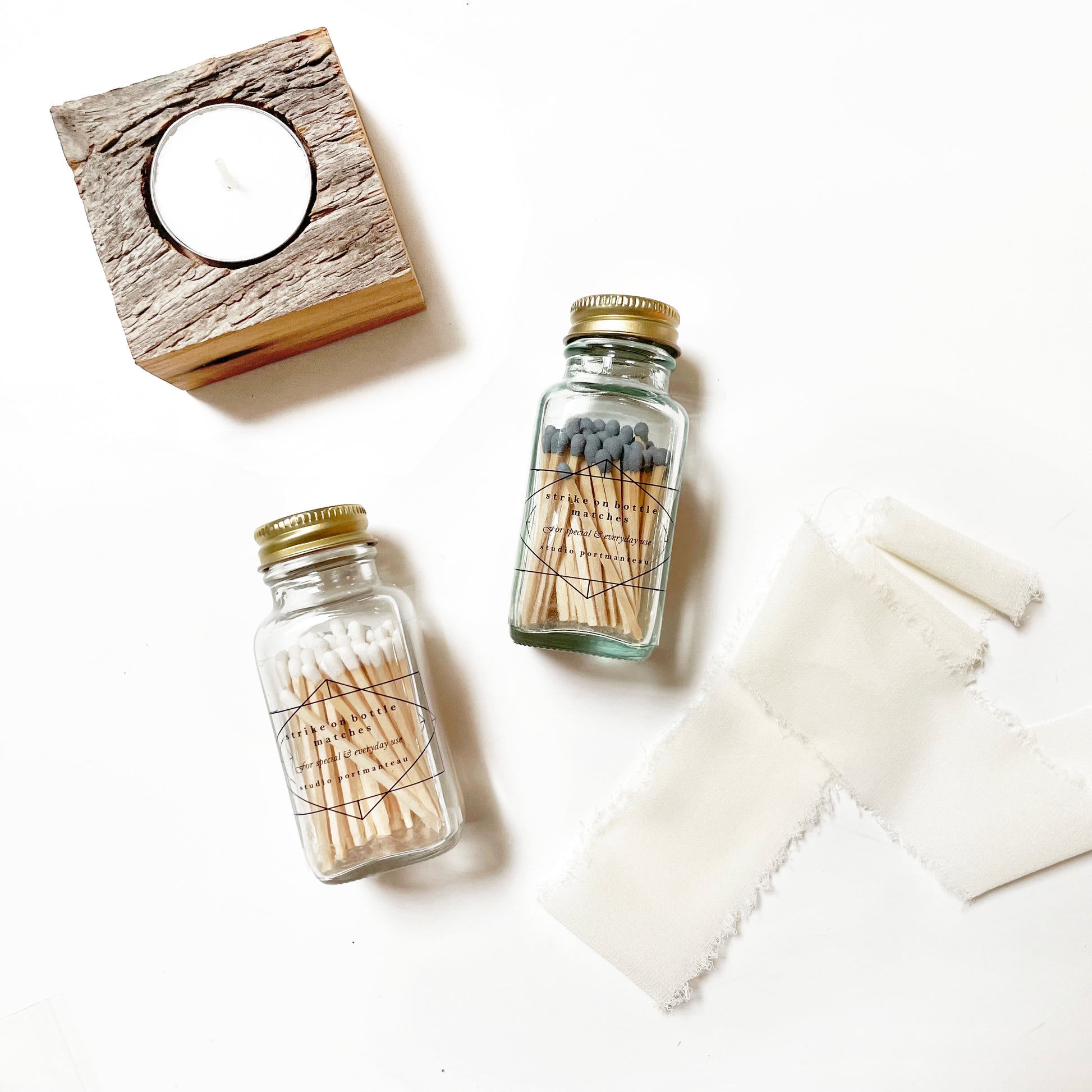 This square glass bottle contains about (80) 2" safety matches with plain white or gray tips, perfect for lighting candles. A clear label with a simple, black, geometric illustration framing the item information adorns the front, and a generous striker strip is conveniently hidden on the back side. The jar comes with a water-tight metal lid. Take your matches anywhere, or keep them on your mantle looking tidy. A moment of calm in a bottle...