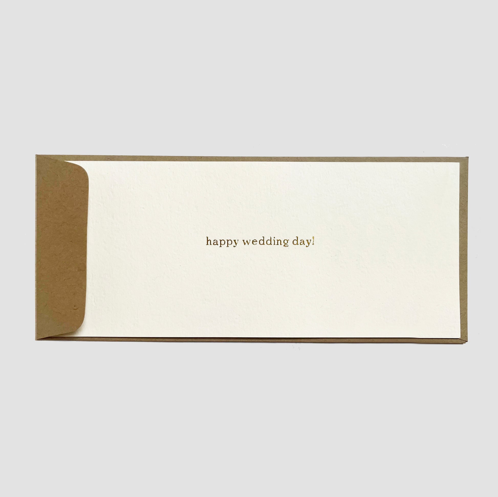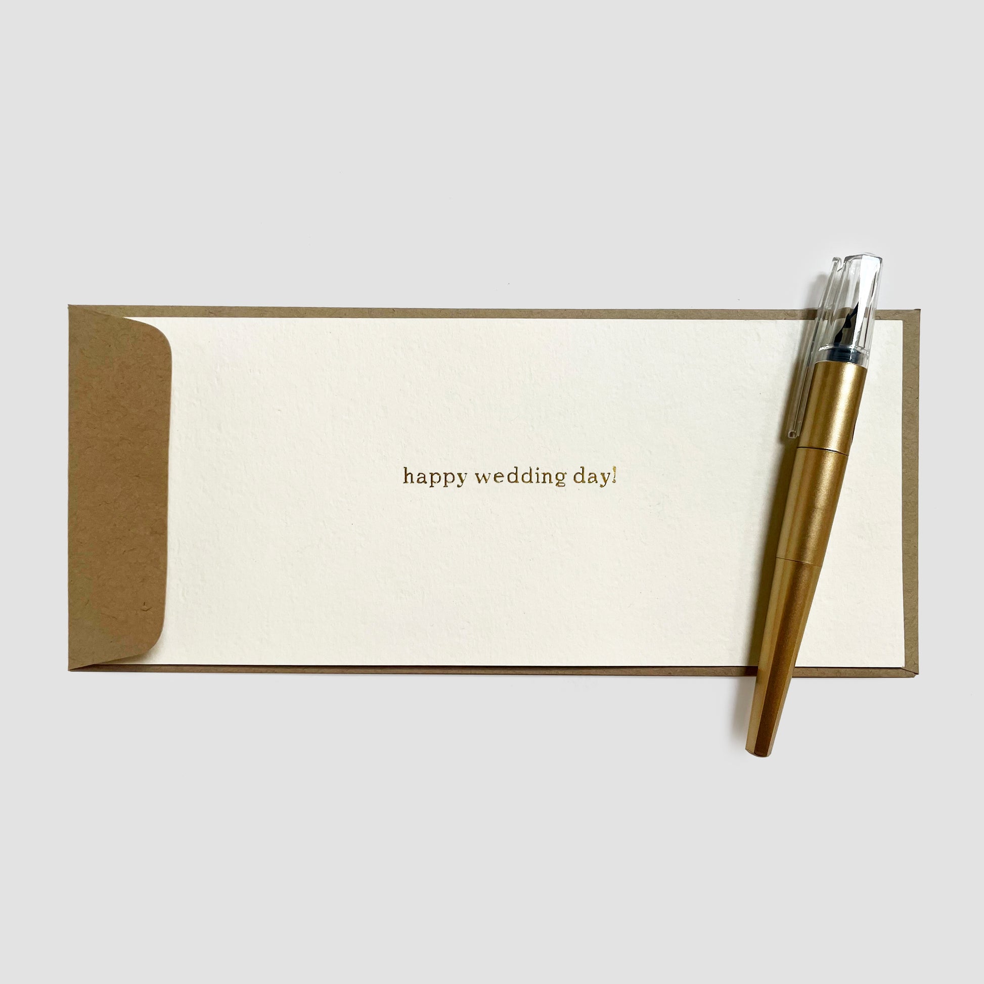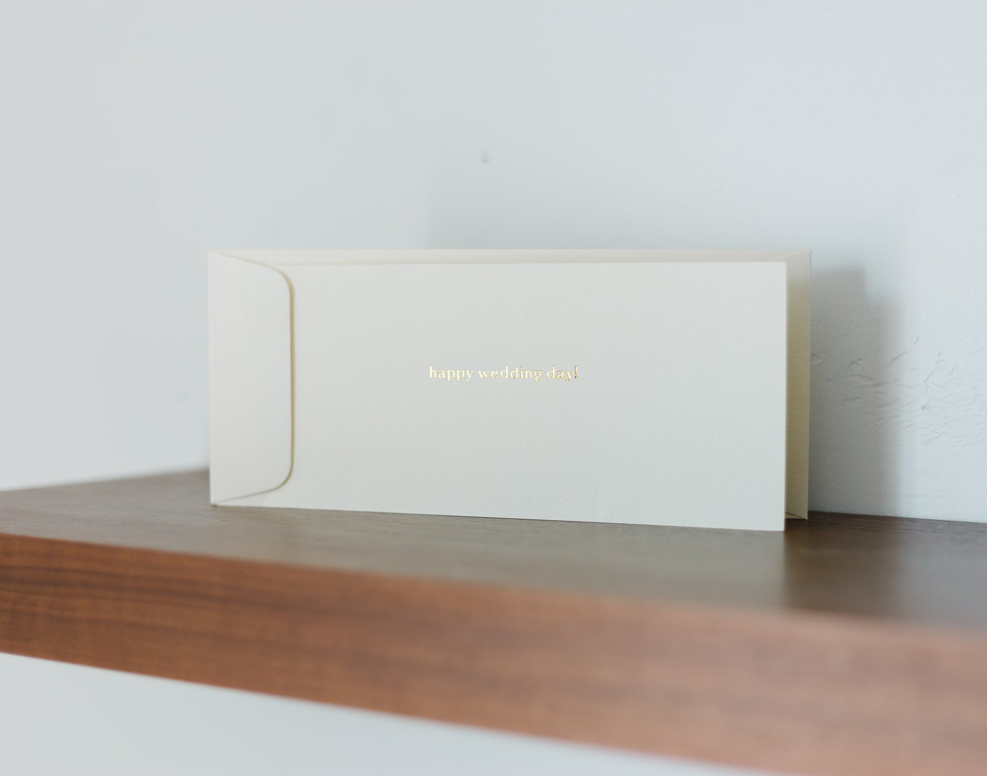 Adorned with your own expression, greeting, favorite quote, names, or other customized phrase in your foil press color of choice on the front side, this flat, heavyweight #10 ivory note card and glam, side-opening kraft or ivory envelope adds the perfect celebratory touch.