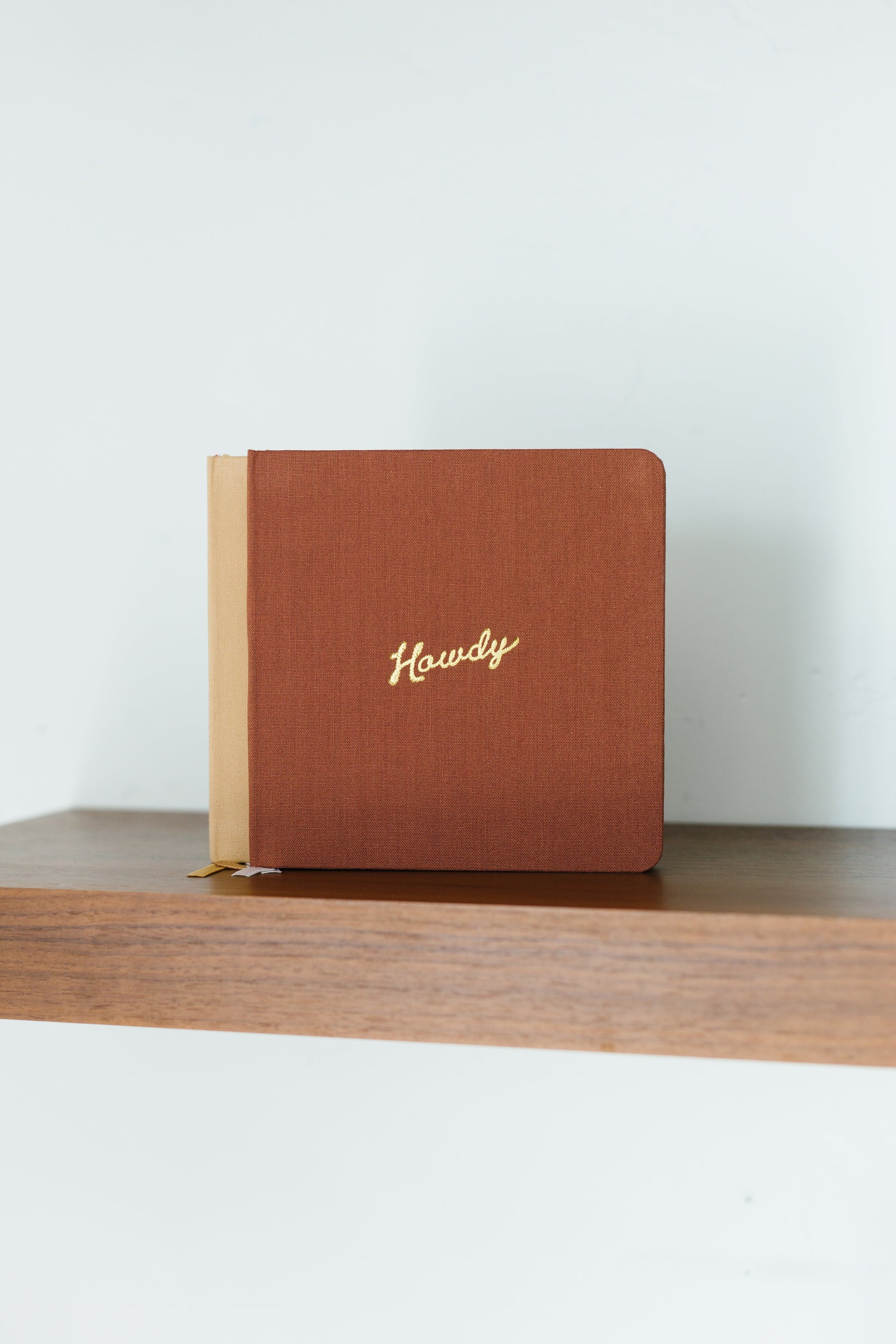 Say "Howdy" in style with one of our classic square linen notebooks, embossed with our custom "Howdy" logo with rope letters, in your choice of foil press color on an earthy rust brown, deep olive green, sandy caramel beige, navy blue, chocolate brown, or honey gold linen bookcloth bound hardcover.