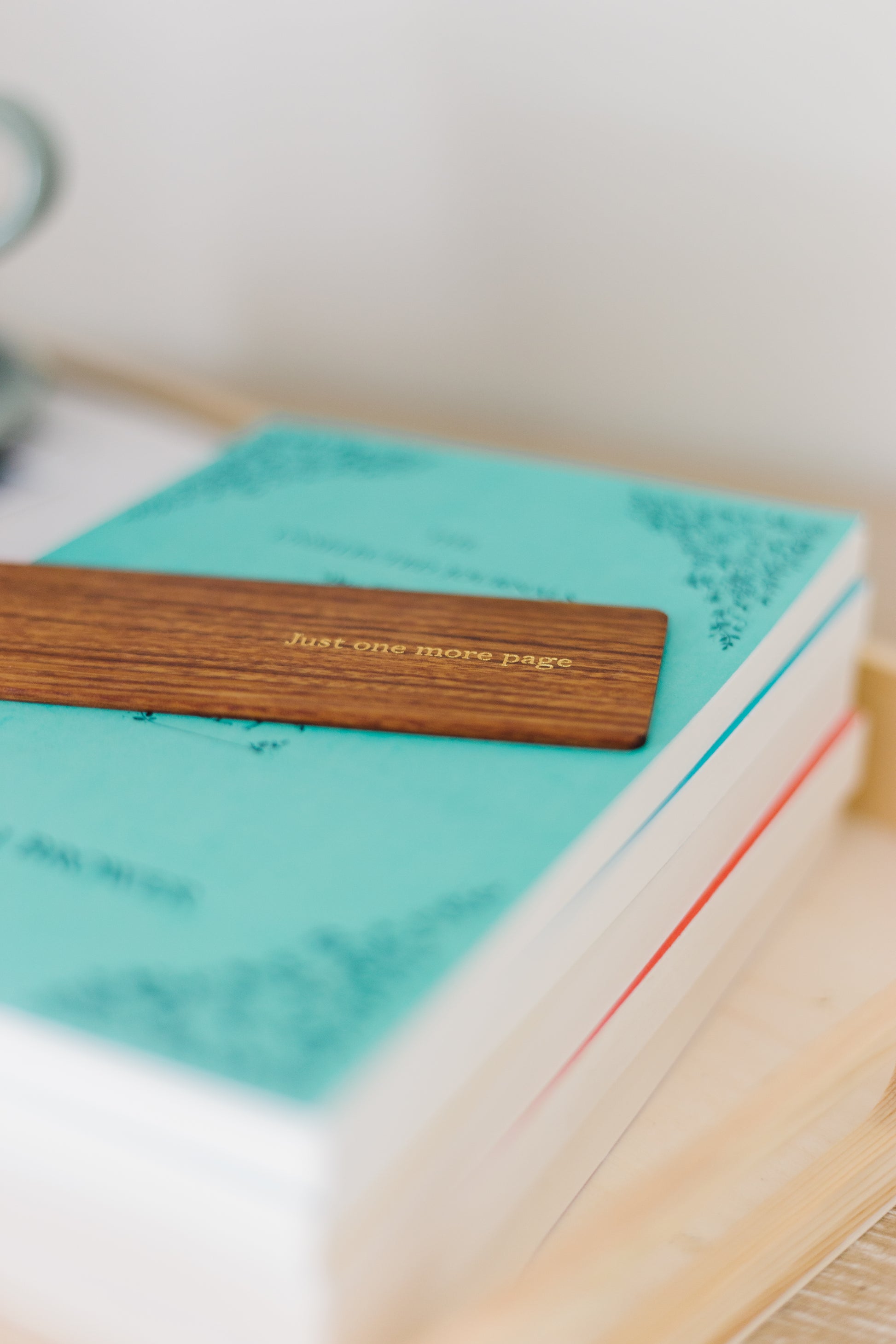 Mark your page in style with these sweet wooden bookmarks, embossed in gold foil with the nightly adage "Just one more page."