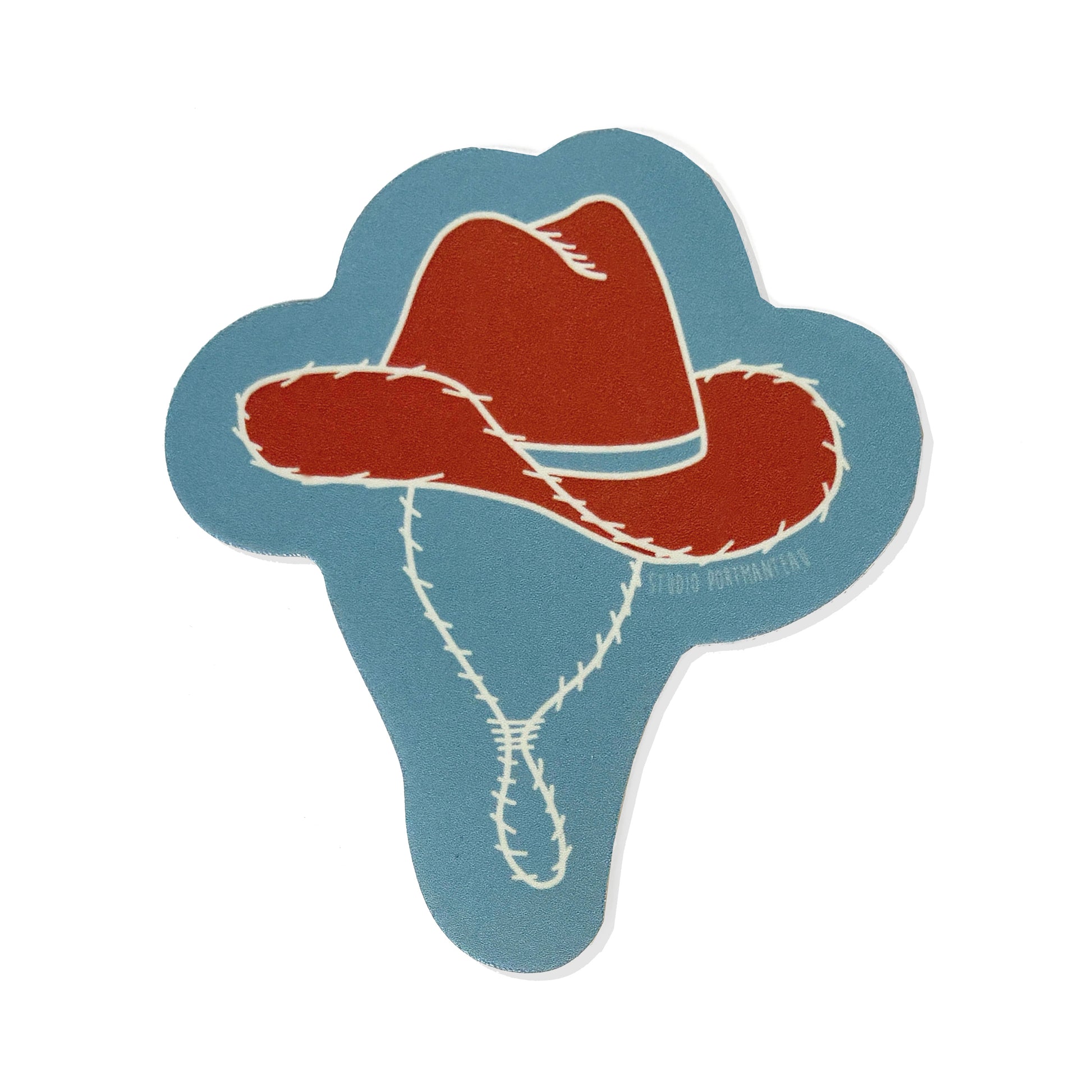 This waterproof, vinyl sticker features our custom rust brown, sky blue, and cream colored classic Western style, cowboy or cowgirl hat illustration with a die cut border. These water-resistant stickers work great on your favorite thermos, water bottle, laptop, phone case, car bumper, notebook, planner, journal, scrapbook, gift wrap, or other special spot!