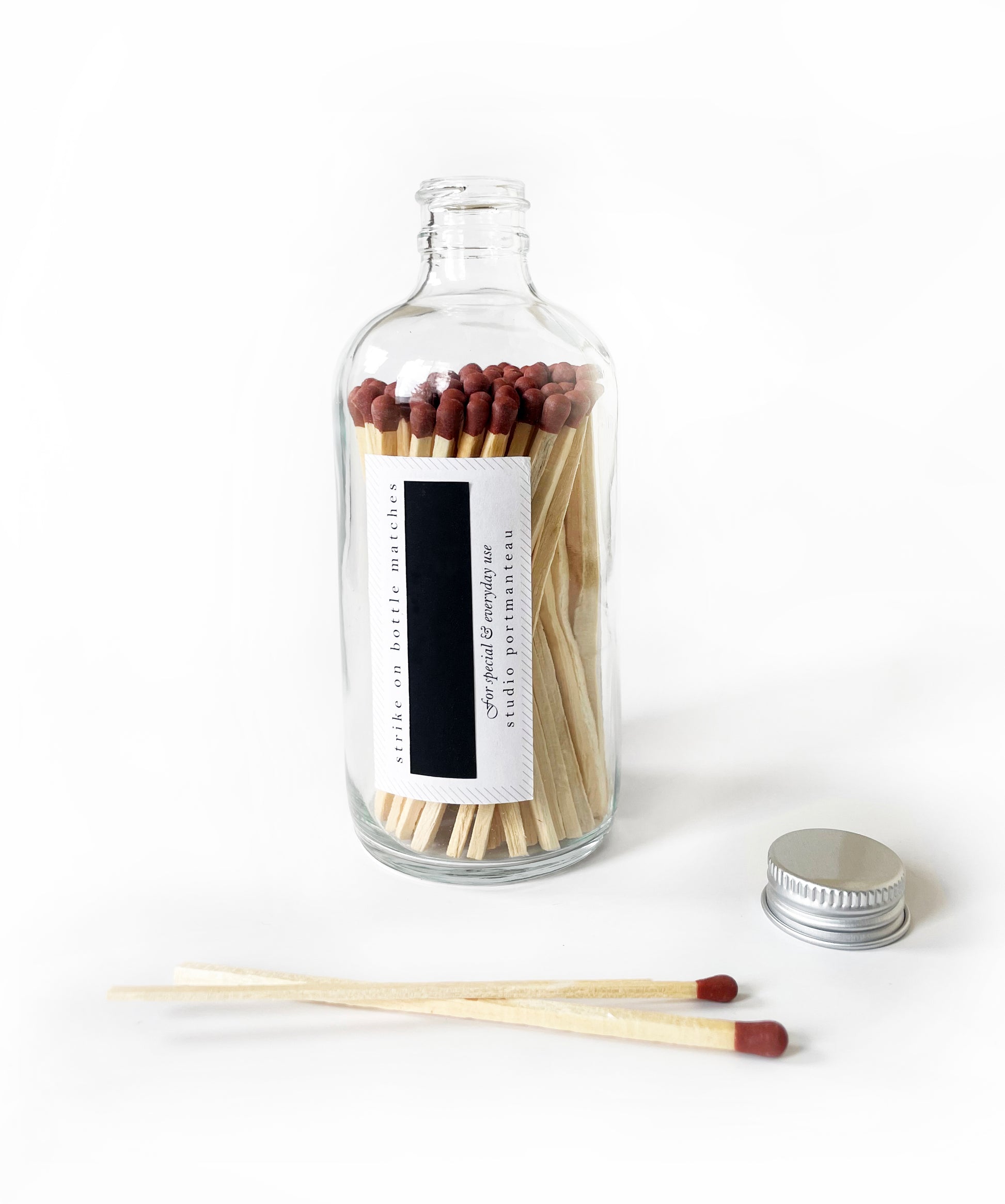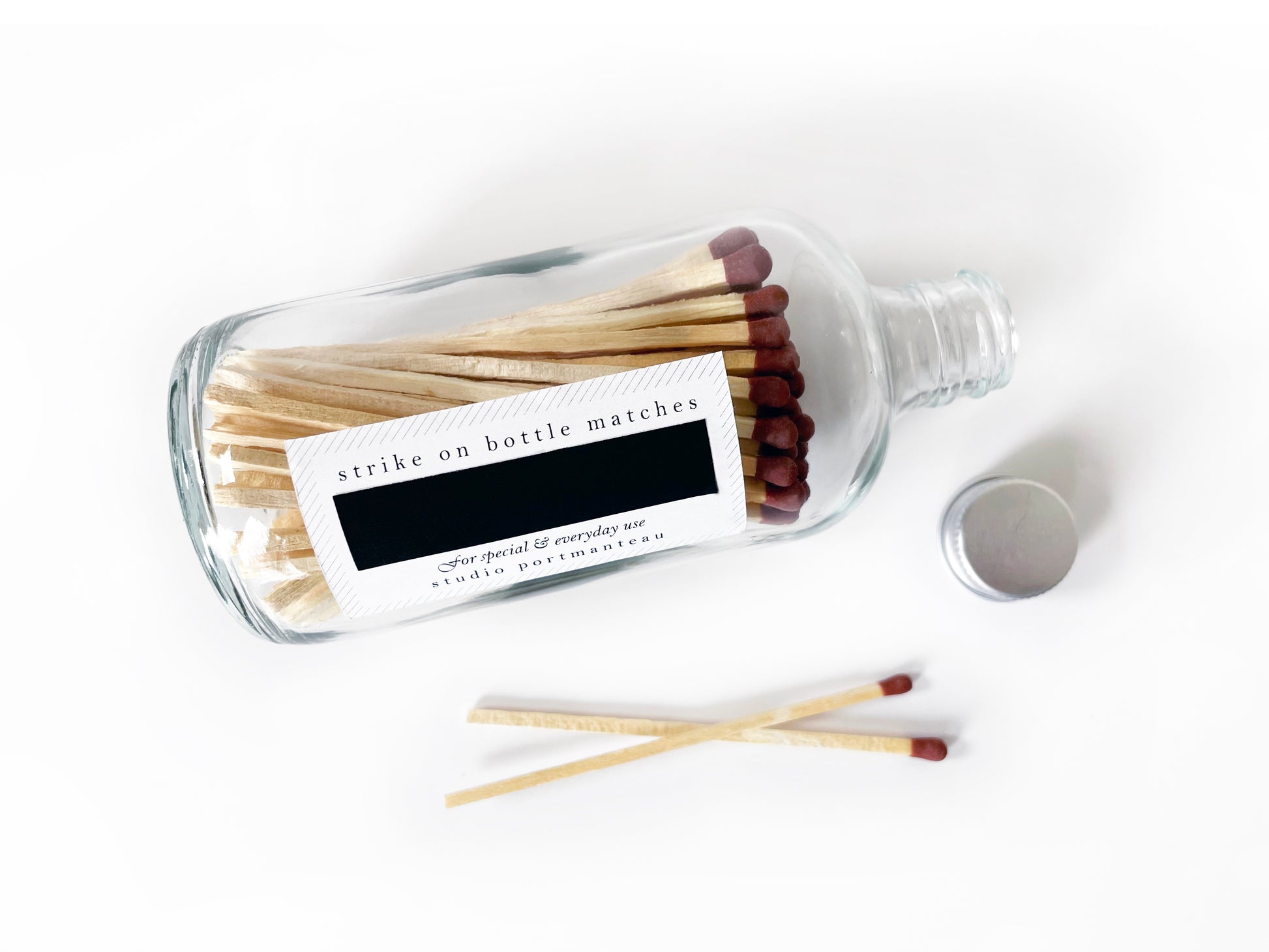 The tall, round glass bottle contains about sixty (60) over-sized, 4" long wooden matches with natural stems and coffee brown tips. A convenient striker strip is incorporated into a simple, signature label on one side. You can hide the label or feature it when you display your bottle, your choice, but it's always there when you need to light a match. The bottle closes with a silver, metal, water-tight lid. Take your matches anywhere, or keep them on your mantle looking pretty. A moment of calm or celebration in a bottle...