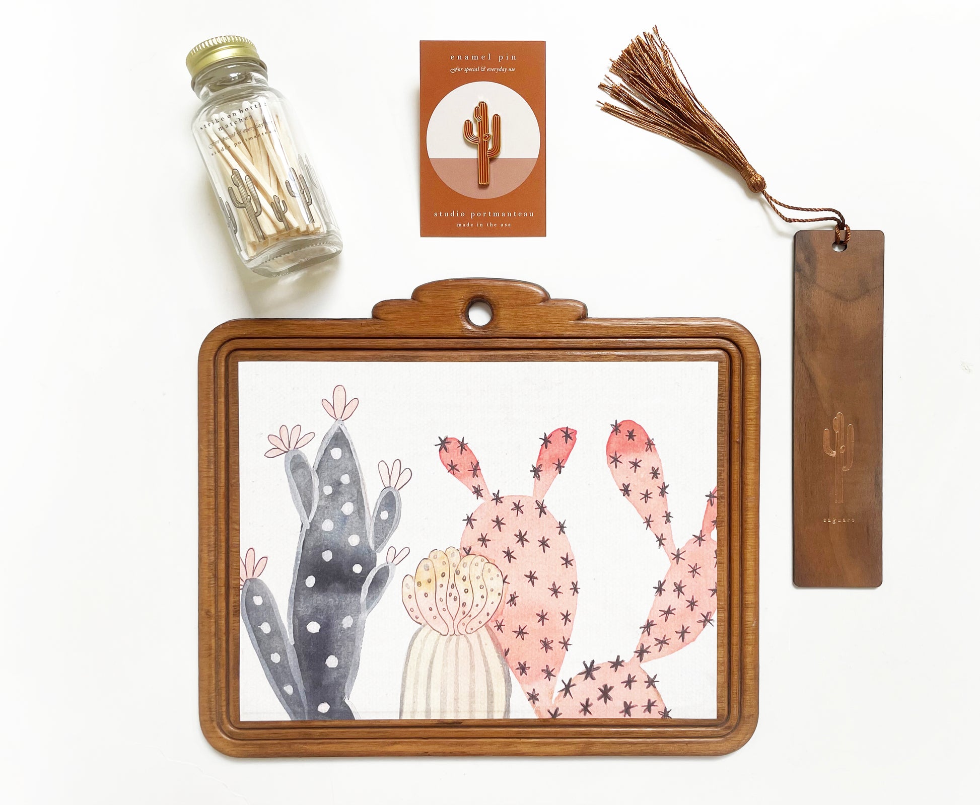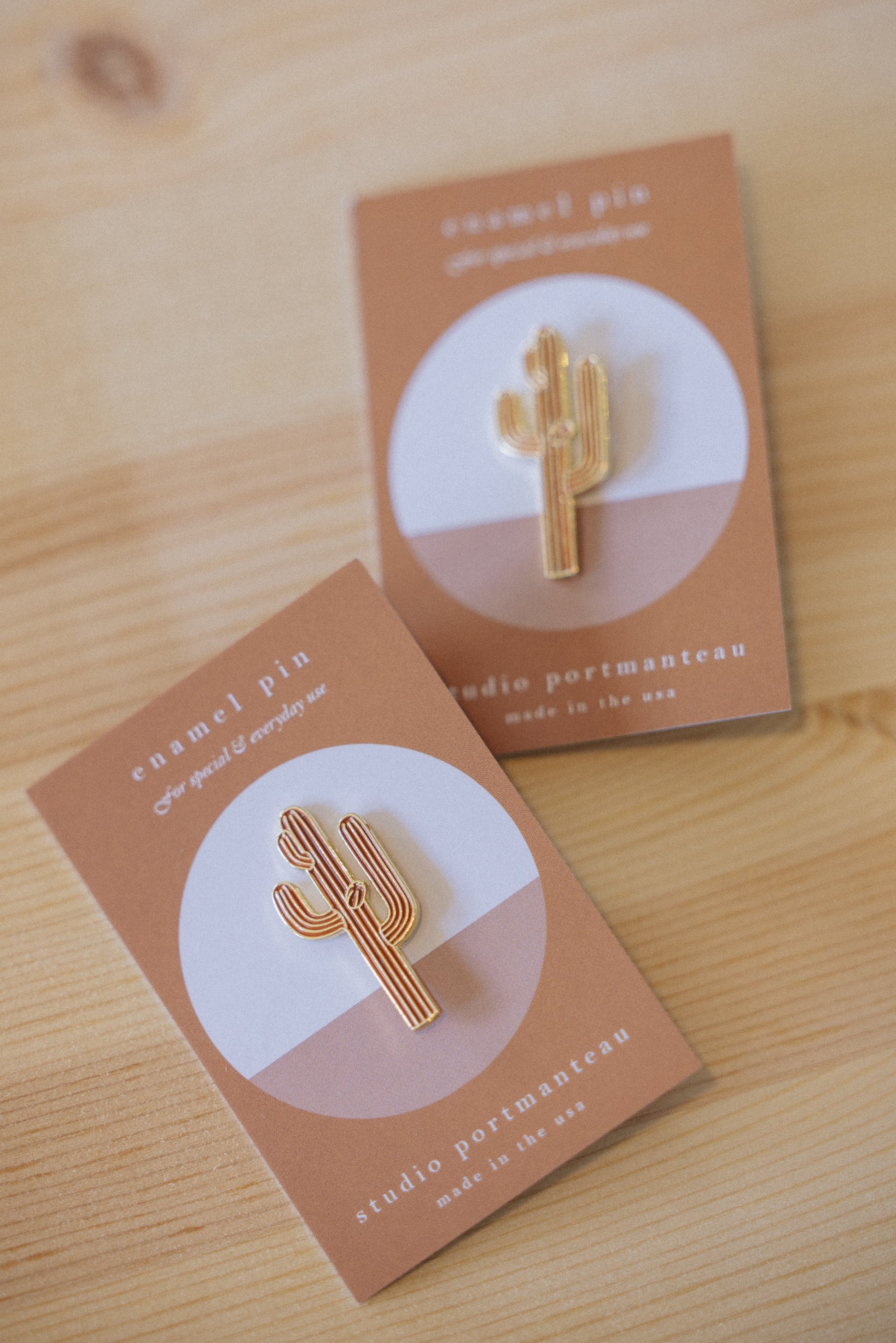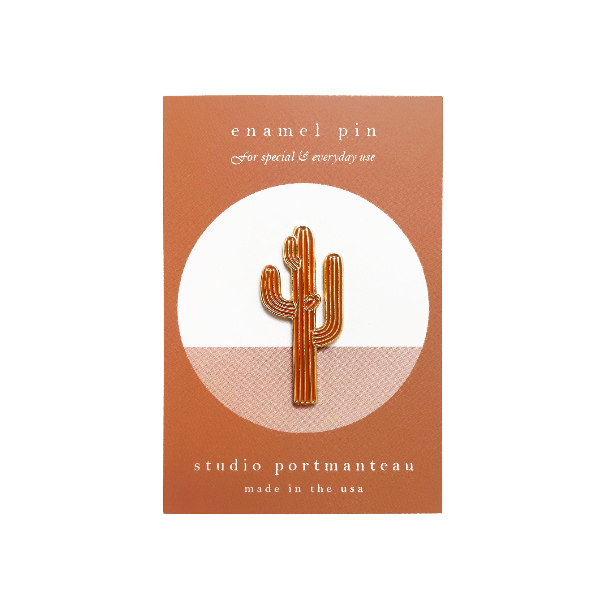 Made from gold-plated zinc with gorgeous rust-colored soft enamel infill in the shape of a miniature botanical illustration of a saguaro cactus, this tiny pin adds the perfect desert touch.