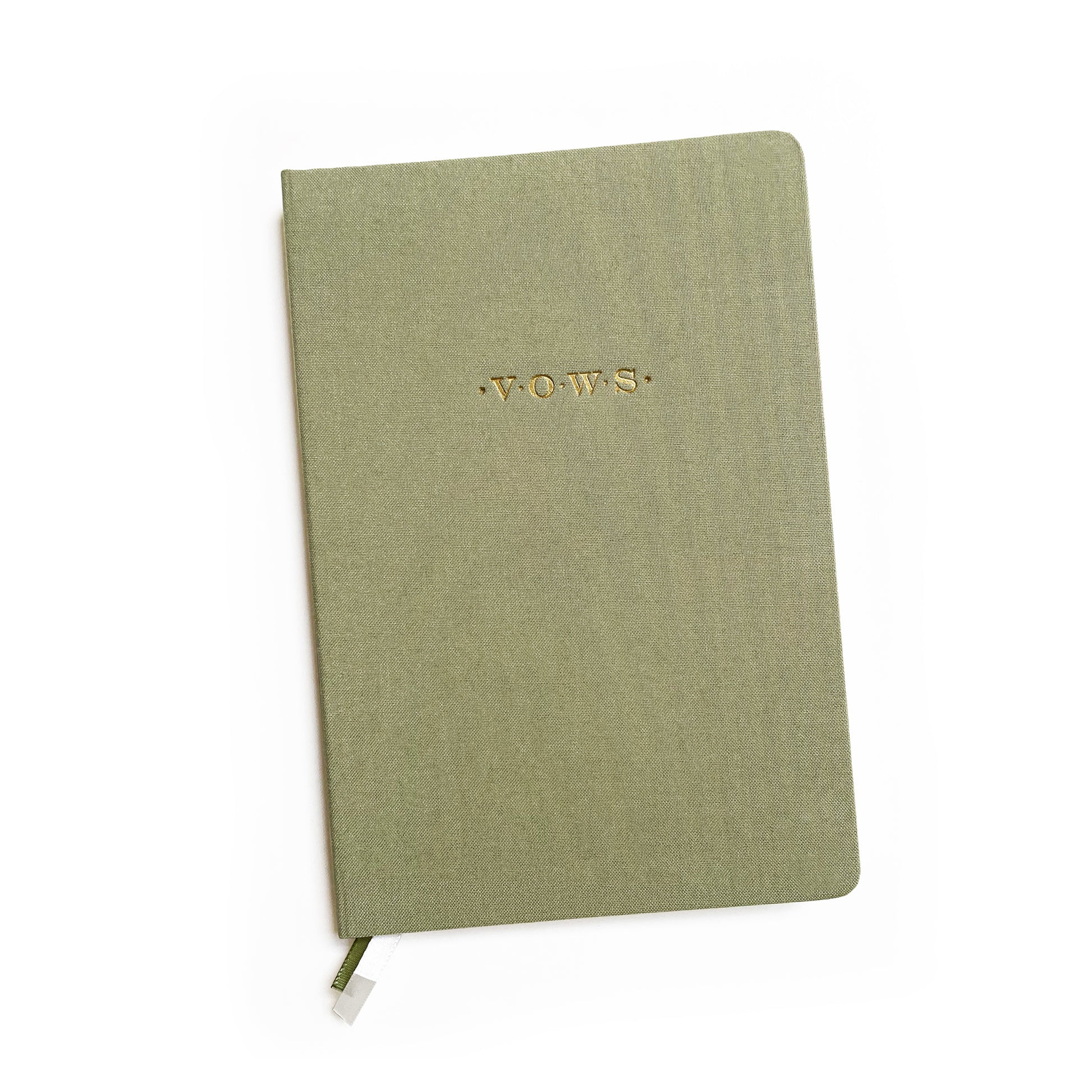Be prepared to tie the knot in style with this classic linen-covered wedding vow book, embossed with our custom "V O W S" typography logo with a petite dot between each letter, in classic gold foil on a rose pink, dusty blue, or sage green linen bookcloth cover.